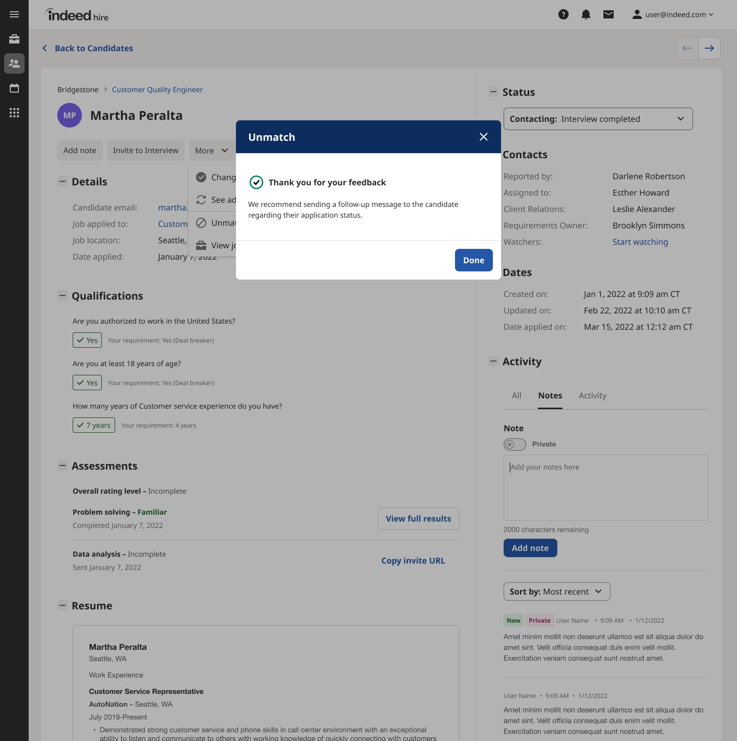 Within Indeed Hire, users called Delivery Specialists are responsible for determining when a candidate is not a match for a job they interviewed for.